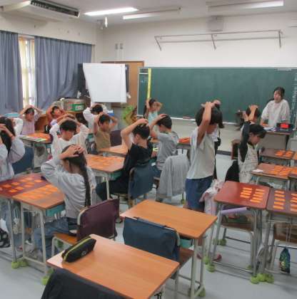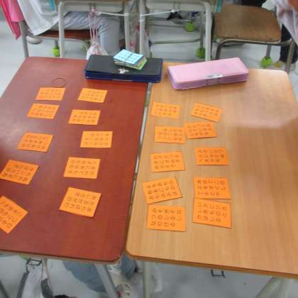 4年生の教室では、二人ペアになり、枚数をしぼって百人一首に取り組んでいました。