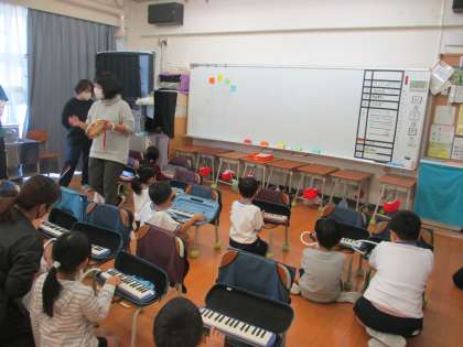 1〜3年生は、どの鍵盤をどの指で演奏するか確認をしながら鍵盤ハーモニカの練習をしていました。