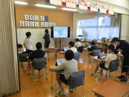 4〜6年生はタブレットを使って地図の学習をしていました。