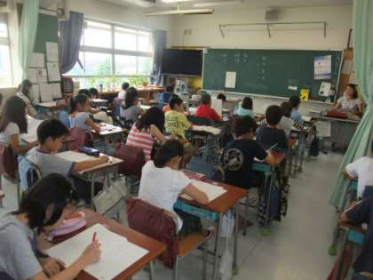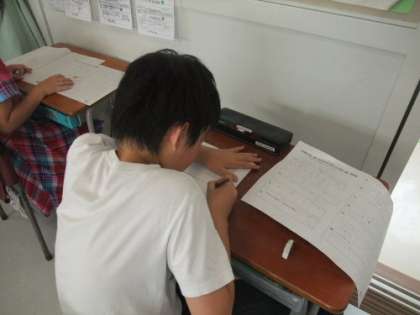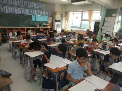 蒸し暑い中、教室で4時間、学力調査のテストです。頑張れ!5年生。