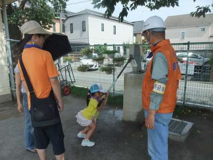受付でいただいた6色の色のリボンごとのチームに分かれ、スタンプラリーをしました。「マンホールトイレの見学」「ピノキオぶるる」「防災用品展示見学」「初期消火訓練」「防災倉庫見学」「地震体験訓練」がありました。
