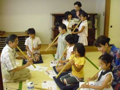 8月21日(火)は“弾いてみよう、吹いてみよう、三曲”で、この日は尺八に挑戦しました。なかなか吹き方が難しく、苦労していました。