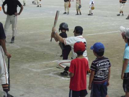 10時半から、校庭では、Tバッティングに挑戦しました。始めはうまくたまにあたらなかった人たちも丁寧に教えていただき、上手にあたるようになっていきました。ものすごい進歩です。