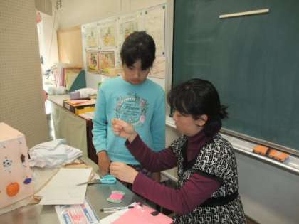 男の子はぎこちない手つきで、女の子は慣れた手つきでミシンを