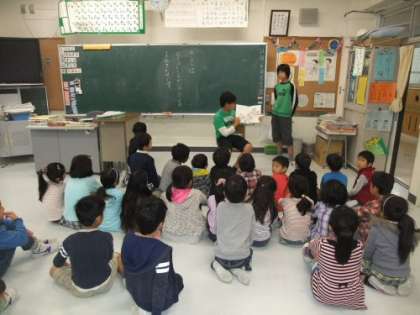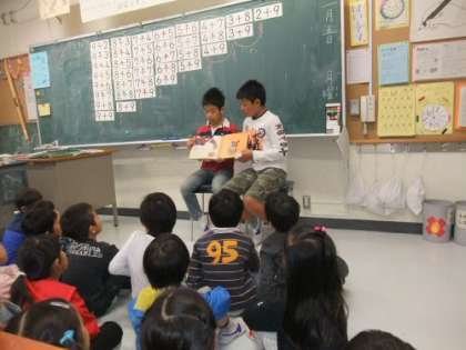 あたります。今朝は、6年生が1年生の教室に出向いて、読み聞かせを
