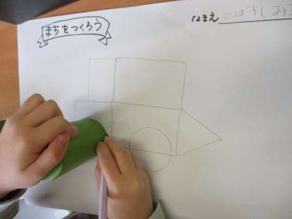 色々な形の立体図形の特徴を確認して、クイズを出し合ったり、図形を使って絵をかいたり楽しく学習に取り組んでいました。