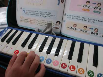 1年生の教室では、鍵盤ハーモニカを使って音楽づくりの学習をしていました。