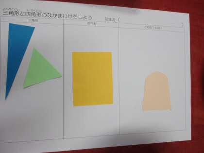 六組の教室では、少人数のグループに分かれて三角形と四角形の学習をしていました。いろいろな形を三角形、四角形、それ以外、に分けて、その理由を発表していました。