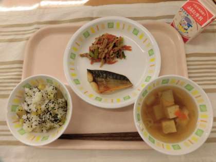 さつま芋ごはん 鯖の塩焼き けんちん汁 煮びたし 牛乳