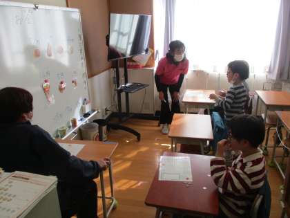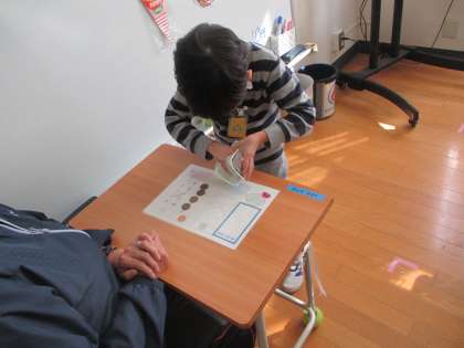 お金を数えようという単元で、実際の1円玉と10円玉を使い、サポーターの先生にお店屋さんになってもらい、買い物をする学習を行いました。