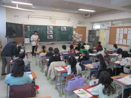 今日は、黒い丸がたくさん書いてある図を見て、九九を使って数えるにはどうしたら良いか学習しました。みんな数のまとまりを意識しながら色々な考え方を発表していました。