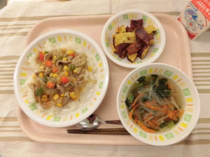 カラフル丼 春雨スープ ダブルさつま芋フライ 牛乳