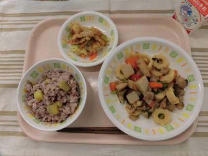 黒米さつま芋ごはん 炒りどり カリカリ油揚げのサラダ 牛乳