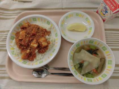 生揚げの四川煮丼 ワンタンスープ りんご 牛乳