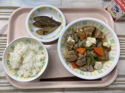 有機米のごはん 豆鯵の唐揚げ 豚肉のすき焼き煮 牛乳