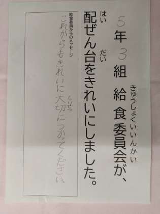 何かのプリントかなと思い、読んだところ、昨日の委員会活動の時間に給食委員会の児童が各教室の給食配膳台の掃除をしてくれて、そのクラスへのメッセージでした。いつもどうもありがとう。