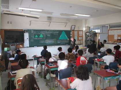 4年生は正三角形を組み合わせ、大きな正三角形をつくり、周りの長さや小さな三角形の数を表を使って考える学習をしていました。