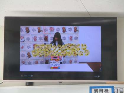 給食の終わりの時間に、月曜日に行われる年末ジャンボ宝くじ集会でクラス代表としてくじを引く人の抽選発表が行われました。