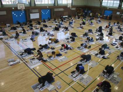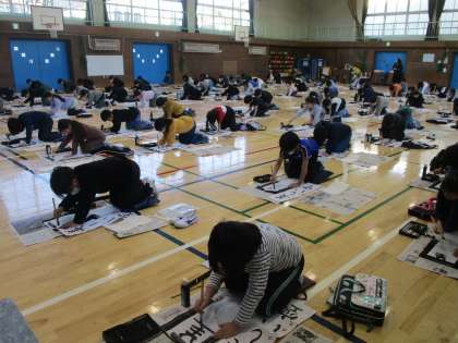 今日から、各学年で書き初めが始まります。毛筆を行う3年生以上は、体育館で学年で一斉に取り組みます。今日の1,2時間目は4年生が「美しい空」という字を集中して書いていました。