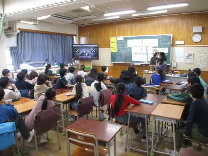 4年生は、This is my favorite place.という学習で、学校の色々な教室の名前をについて学習していました。好きな教科やそれを勉強する場所などを英語でどのように言うか、専科の先生やALTの先生と一緒に学習しました。
