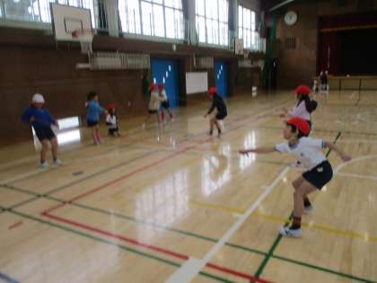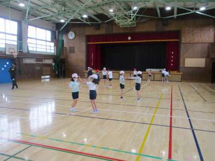 2年生は体育館で、紐を引きあったり、お互いに向かい合って手で押しあったりと、二人組で楽しく体育の学習をしていました。