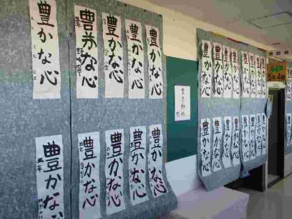 今週から教室前で書き初め展を行っています。5年生は毛筆で、「豊かな心」と書きました。
