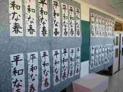 今週から教室前で書き初め展を行っています。6年生は毛筆で、「平和な春」と書きました。