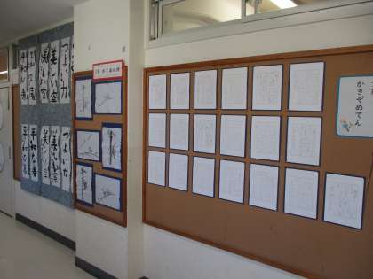 今週から教室前で書き初め展を行っています。六組は学年に応じて硬筆・毛筆で、それぞれの学年の字を書きました。5年生が体験した水墨画の作品も展示されています。