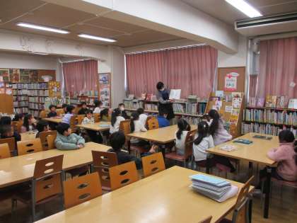 今日は2年生が図書室で司書の先生の読み聞かせを聞いたり、好きな本を読んだりしました。
