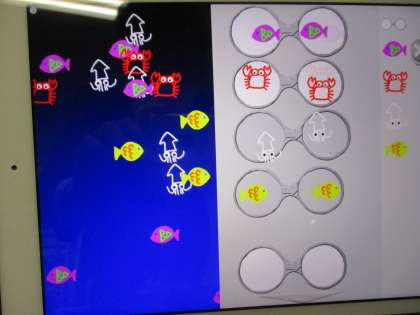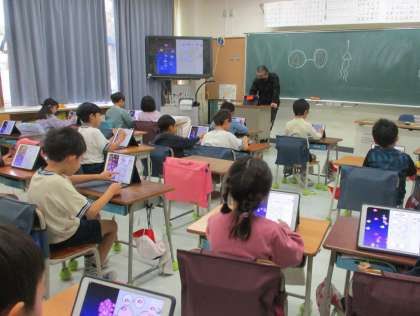 1年生は、学習用のiPadのビスケットというアプリを使い、プログラミングの学習をしています。今日のテーマは海の中、ということで、魚を左から右に動かしたり、カニを左右に動かしたりと、どのように動かしたら良いか先生の話を聞きながら楽しそうに取り組んでいました。