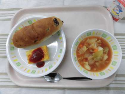 ぶどうパン チーズ入りオムレツ ミネストローネ 牛乳