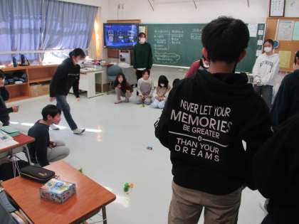机を端に寄せ、手回し発電機で電気をつくり、電気をため、自動車を動かして、電気の特徴を確かめていました。