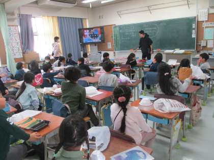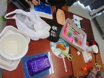 1年生の教室では、家から持ってきた発泡スチロールの容器を使い、図工の学習をしていました。色を塗る児童、はさみで切る児童、自分の発想を生かして楽しそうに取り組んでいました。