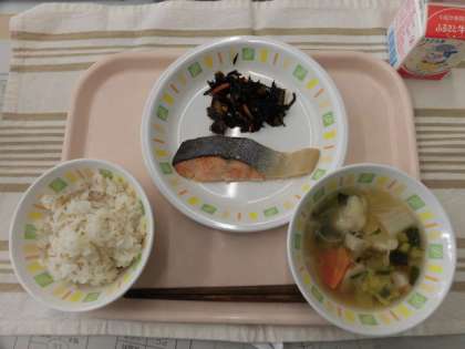 ごまごはん 鮭の塩焼き すいとん汁 ひじきの炒め煮 牛乳