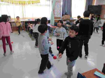 2年生は生活科の昔あそび体験をしています。今日は練習したけん玉を1年生に教える活動をしていました。「1年生がすぐにできるようになったよ」「やっぱり2年生はすごいや」などの声が聞こえてきました。