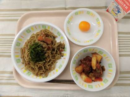 ソース焼きそば レバーとポテトの甘辛和え きんかん 牛乳