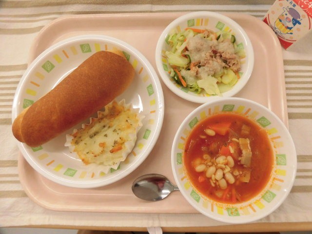 米粉入りパン じゃが芋のチーズ焼き ミネストローネ ツナサラダ 牛乳