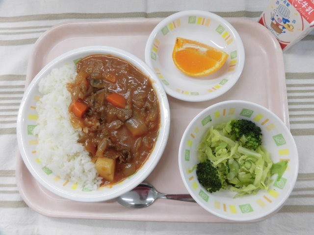 ハッシュドビーフ グリーンサラダ デコポン 牛乳