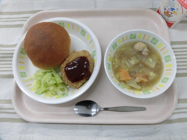 セルフコロッケバーガー(無塩丸パン 手作りコロッケ ボイルキャベツ) ABCスープ 牛乳