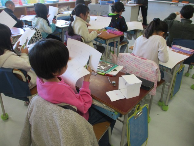 前の授業で学習した立方体の展開図を参考に、本時では直方体についてどのような特徴があるか、実際に展開図を作りながら考えました。
