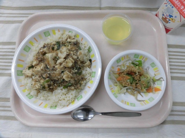 麻婆豆腐丼 キャベツともやしのごまだれ りんごゼリー