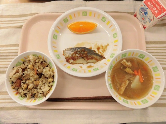 大豆入りひじきごはん サワラの香味焼き ねぎと油揚げのみそ汁 清見オレンジ 牛乳