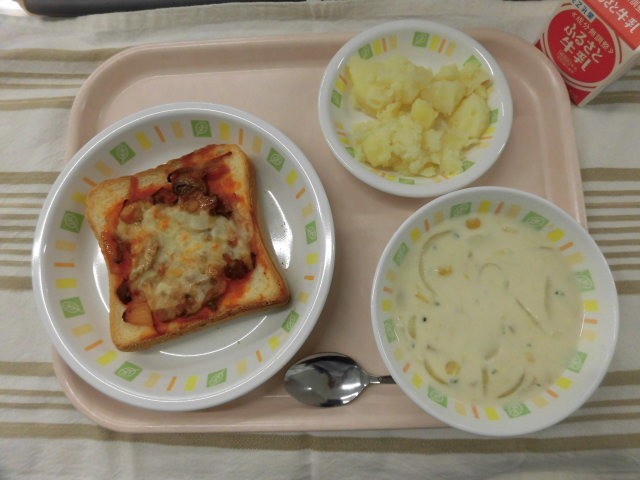 ピザトースト コーンポタージュ 粉吹芋 牛乳
