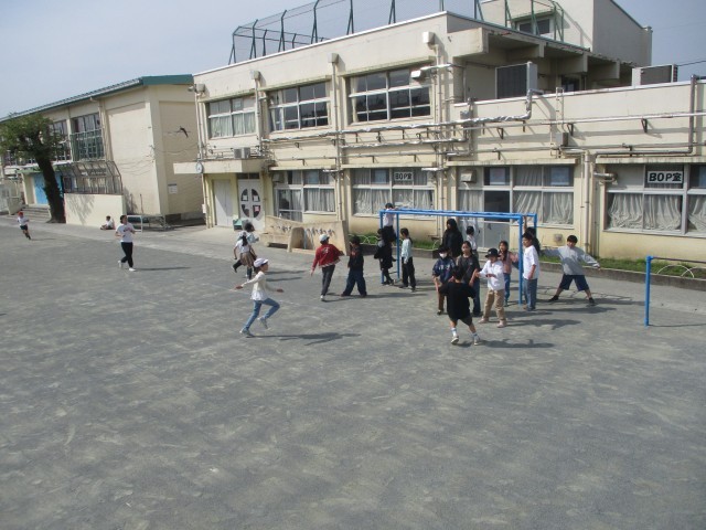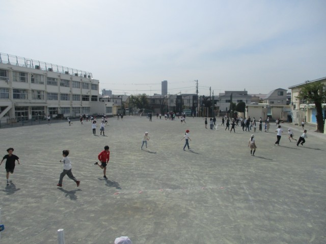 校庭いっぱいを使って鬼ごっこをしていました。