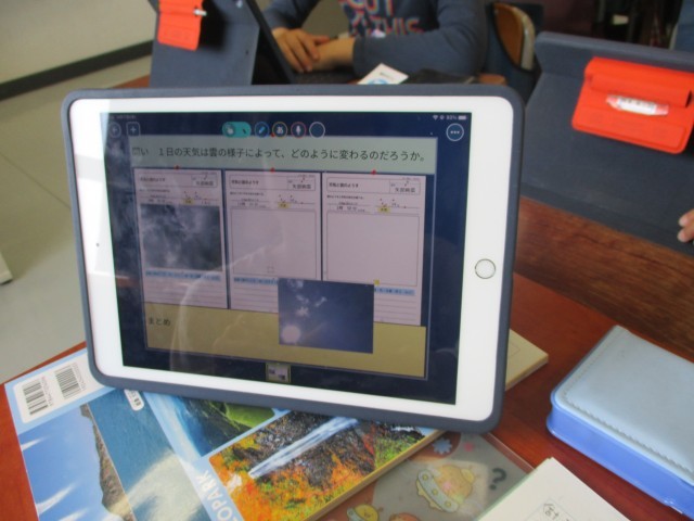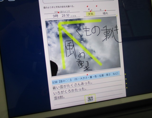 雲の動きをタブレットで撮影してワークシートに気が付いたことを書き込んでいます。