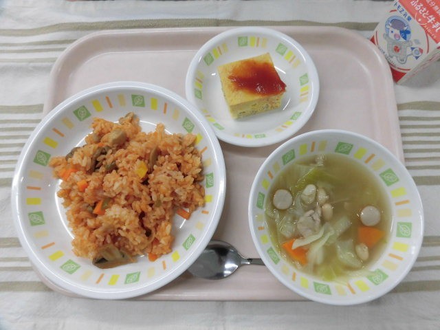 チキンライス チーズ入りオムレツ 白いんげん豆の田舎風スープ 牛乳