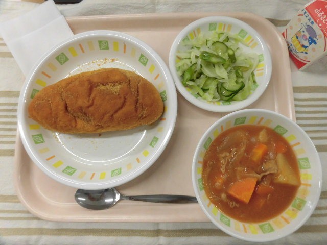 きなこ揚げパン 米粉のポークシチュー グリーンサラダ 牛乳