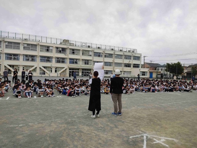 地震の想定で、放送を聞いて、校庭の第1避難場所に避難しました。