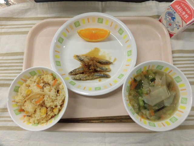 中華おこわ キビナゴのねぎソース ワンタンスープ 清見オレンジ 牛乳