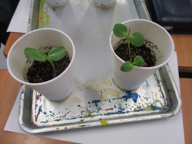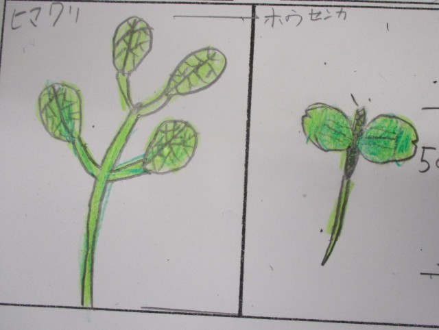 種をまいて育てた2つの子葉の様子を見比べ、使用の形やくきの長さ、色なども注意深く観察して、違いをまとめていました。